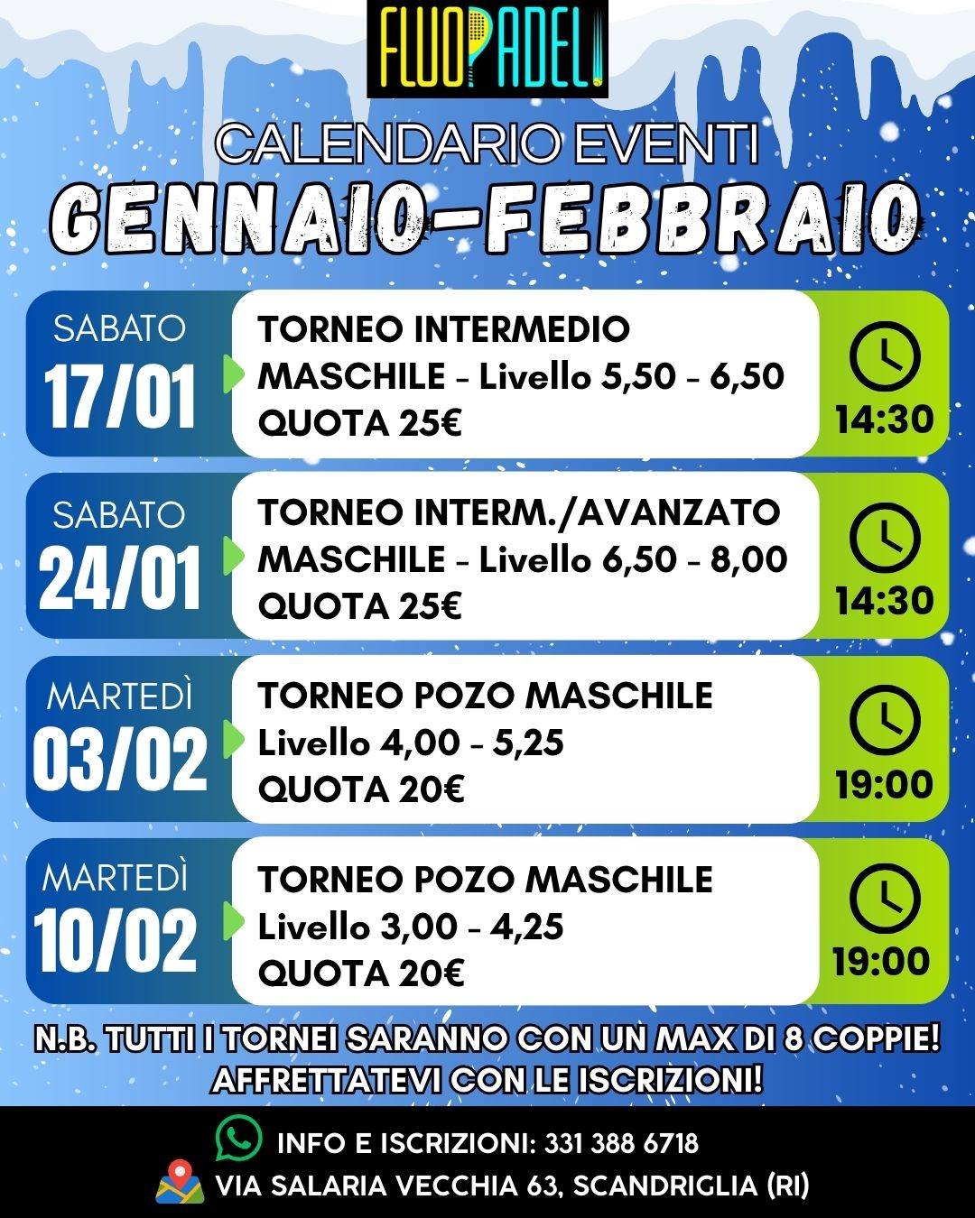 • MARTEDI' 10 FEBBRAIOTORNEO POZO MASCHILE LIV. 3,00/4,25 - START ORE 19:00
